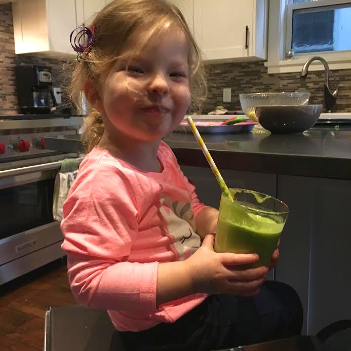 Miss Q is all smiles about her green smoothie