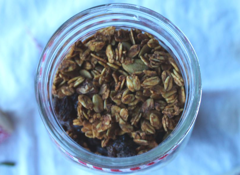 This pumpkin granola is easy to make and delicious. Who doesn’t love homemade granola? Nothing better than a bowl of fresh crunchy oats, toasted nuts, and fresh spices. Granola takes about five minutes to make but everyone will think you slaved away for hours in the kitchen.  Place the granola in mason jars along with some fancy ribbon to add a festive touch.