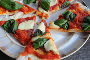 Pizza is a family favorite in our house. We have a great pizza place in our neighbourhood which we regularly visit. My must haves are thin crust, fresh ingredients, and minimal toppings. This past weekend I decided to make my own after seeing these mouth watering flatbreads from foodiecrush. To be honest, I don’t have a lot of patience when it comes making dough which is why I would prefer take out to homemade. But this recipe from the kitchn totally caught my eye. Quick and no rising involved. Now that’s what I call a winner.